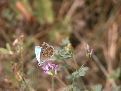No es siempre azul, en septiembre lo veremos convertido en amarillo, pero ahora podemos descubrirlo en otros colores. Al principio del verano era blanquecino, ahora va azulándose, y en septiembre lo veremos dorado y reseco por el sol. Su nombre es Cardo yesquero o cardo abadejo (siempre cardo), y el científico es "Echinops ritro" o "Echinop sphaerocephala"(una de las dos especies, no llego muy bien a diferenciarlas.. Y como dicen los botánicos: "la planta es aperísima, punzante y hórrida. Aquí, no podemos decir aquello de "eres más feo que un cardo", porque su color y la redondez de sus flores lo hacen atractivo. Incluso hay quien los recoge en esta época (azulados) para secarlos en la sombra, y servir de adorno. |