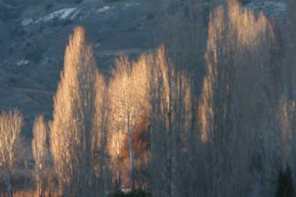 | El sol de abril cayendo sobre la iglesia, al fondo las eras verdeciedo, olvidando el incendio. Y en primer plano, los brotes de los chopos que empiezan a verdear. | ||