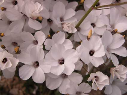 | Esta semana el color de las cuestas es el blanco, no el amarillo de las aliagas. Y todo está cubierto de estas pequeñas florecillas, que parece que han nacido de la nada. Increible. Su nombre es "linum siffruticosum", o mejor llamado lino blanco. Su nombre deriva del griego "lino" (hilo, hebra, en alusión a la fibra que se obtenia de la planta). Son plantas pequeñas, que el resto del año pasan desapercibidas, compuestas de ramillas, con pequesísimas hojas.(Dentro de paisaje-botánica, páramo, te hablamos más de esta planta) | ||