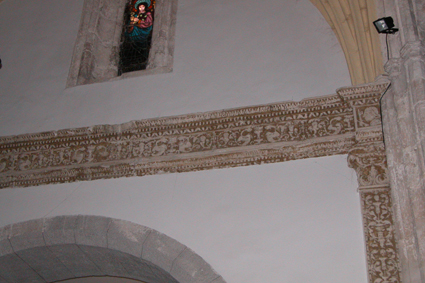 La cabecera del templo tiene un gran arco triunfal, semicircular, escoltado de haces de columnillas rematadas en pequeños capiteles de decoración folácea. |
